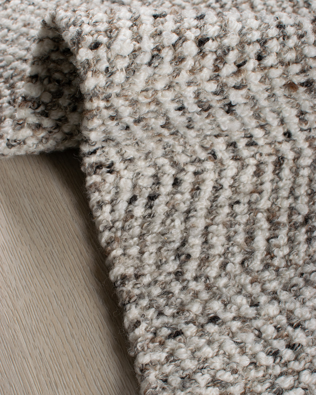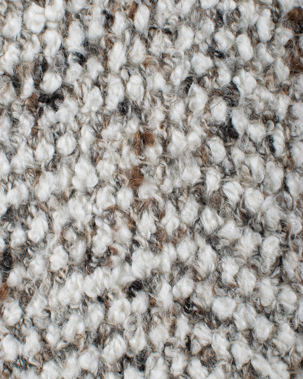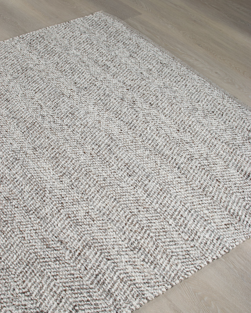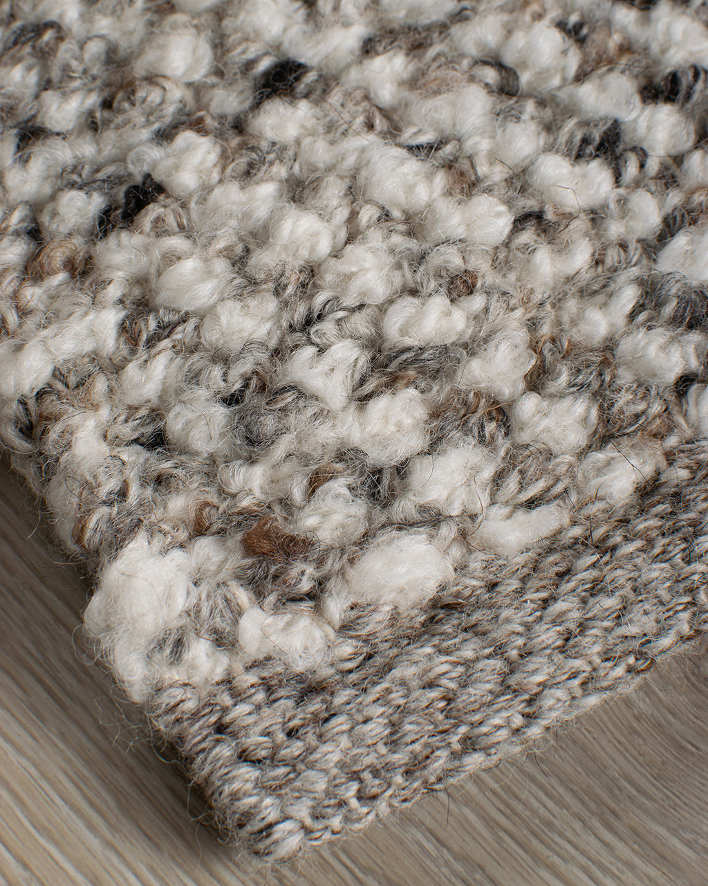 Dette håndlavede tæppe er fremstillet af 100% New Zealand uld i farven White Stone, hvor lyse og naturlige toner smelter sammen i et elegant og levende udtryk. Ulden giver en behagelig overflade og understøtter tæppets naturlige karakter.